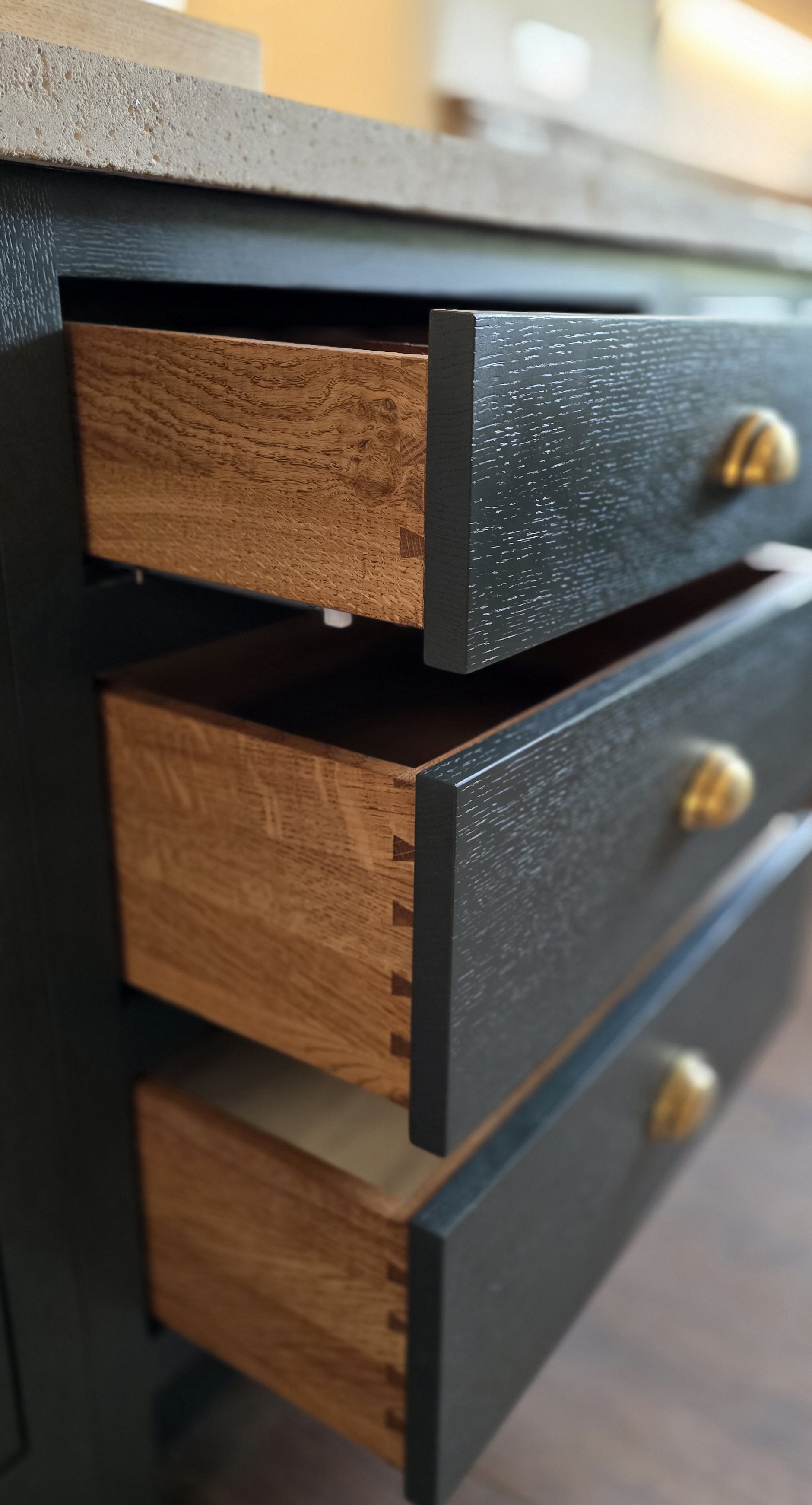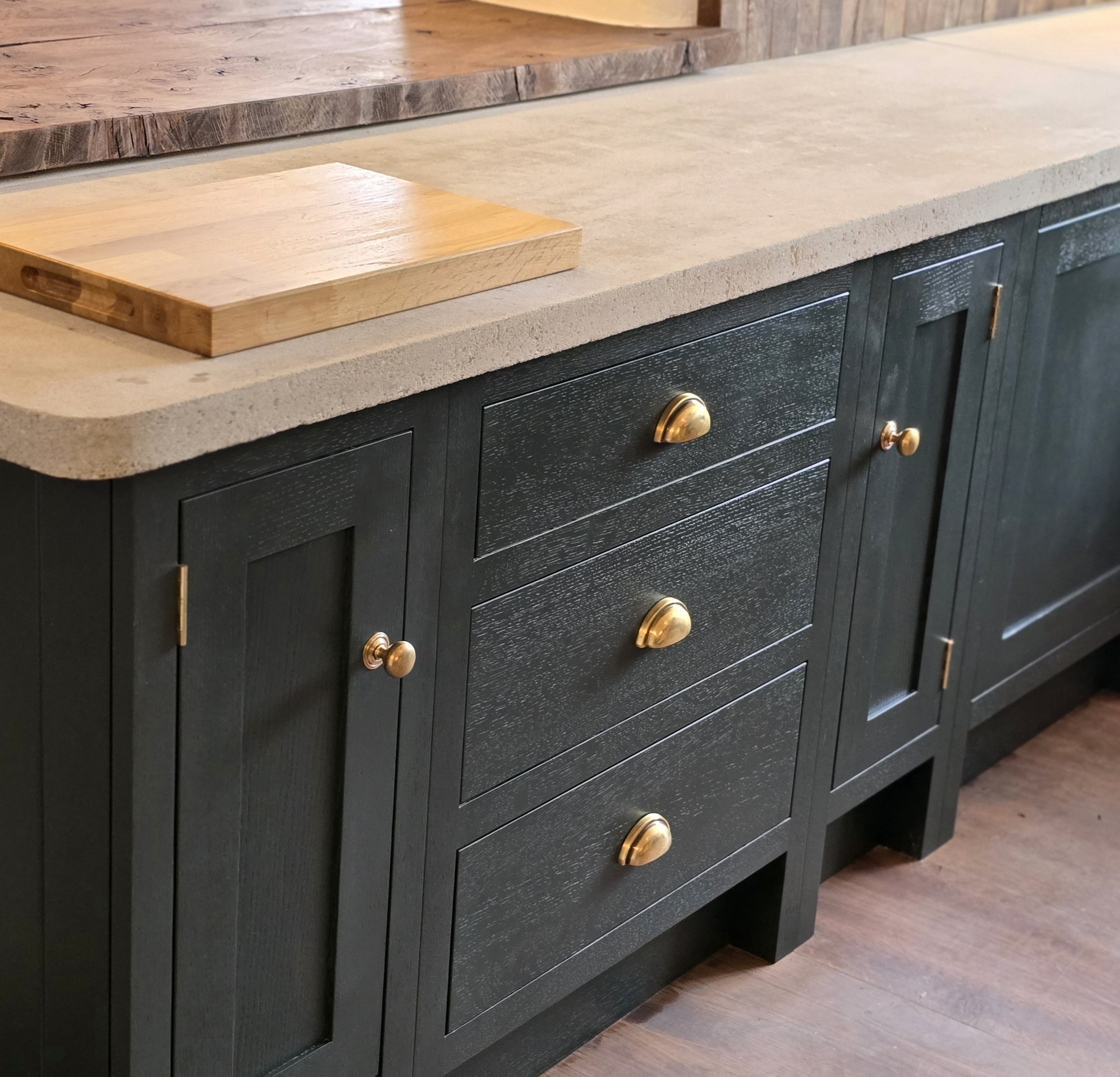 This elegant design is based around an in-framed style and encompasses the shaker concept of clean lines and simplicity, making it a beautiful and unique choice for your home. The shaker door features a chamfered edge to the door-rails. The framing has its own bespoke feet which extend to the floor, this creates a stepped-back plinth for each unit, giving the appearance of luxurious individual furniture.